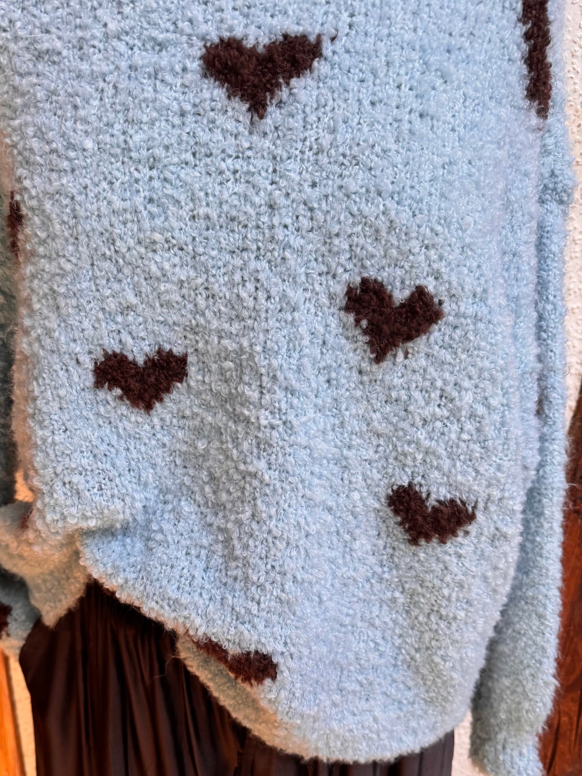 Klasse Farbkombi türkisblau mit braunen Herzchen, Rundhals, überschnittener Ärmel, super kuscheliges Material aus 25% Wolle, 16% Alpaka, 9%Viskose, 10% Polyester und 40% Acryl Onesize Gr 36 - Gr 42