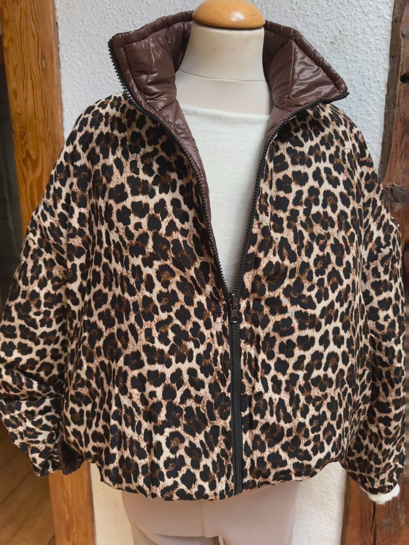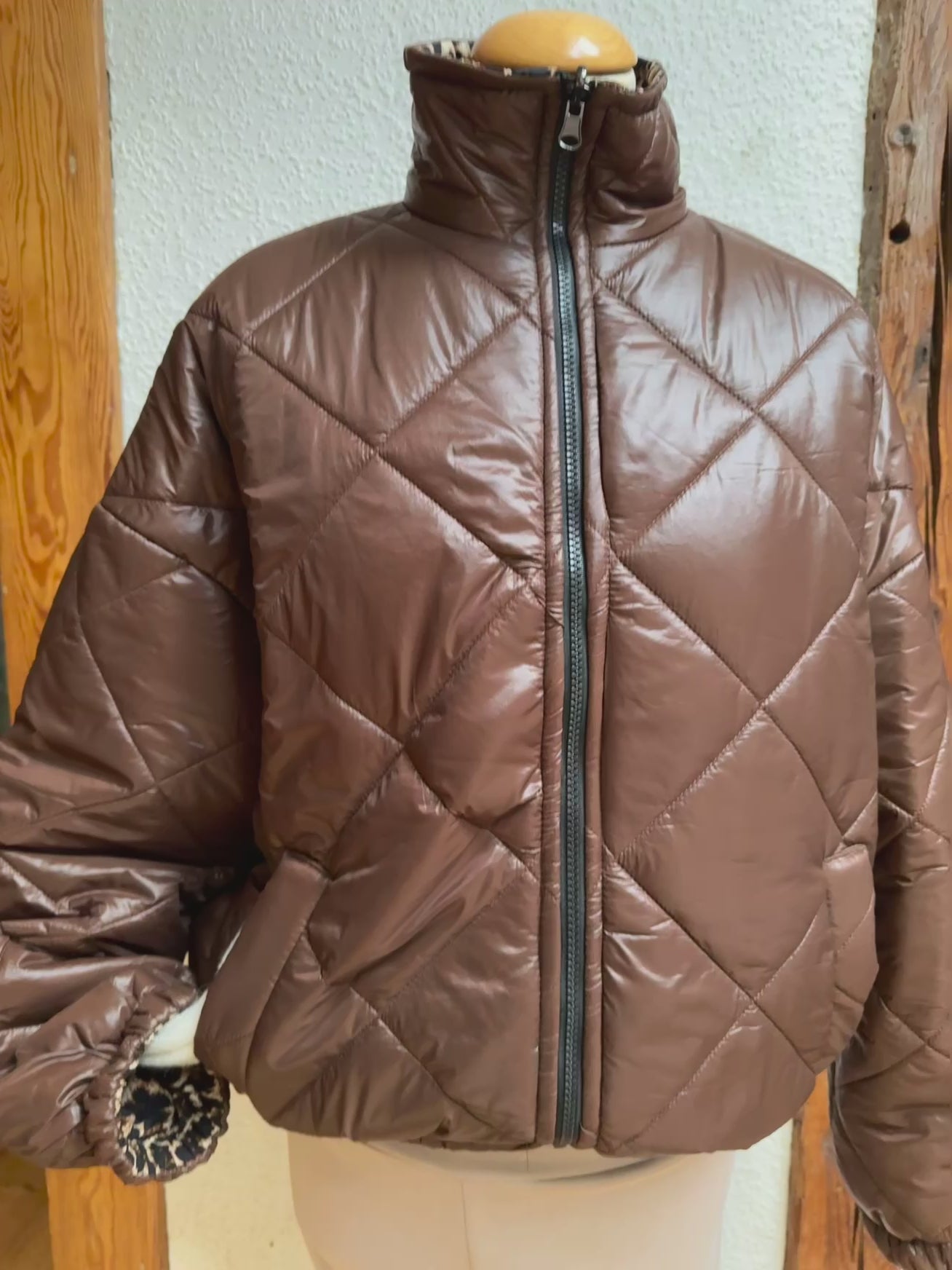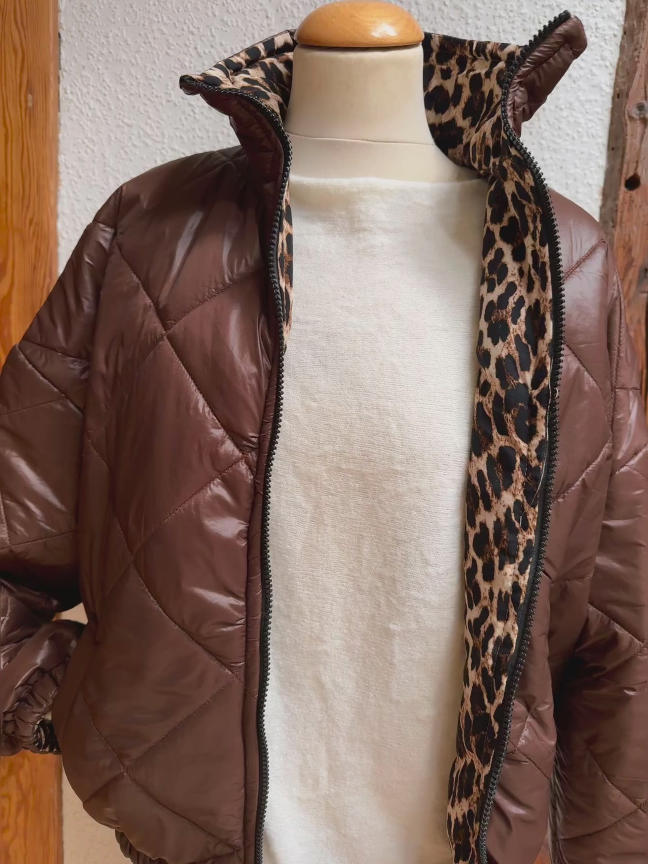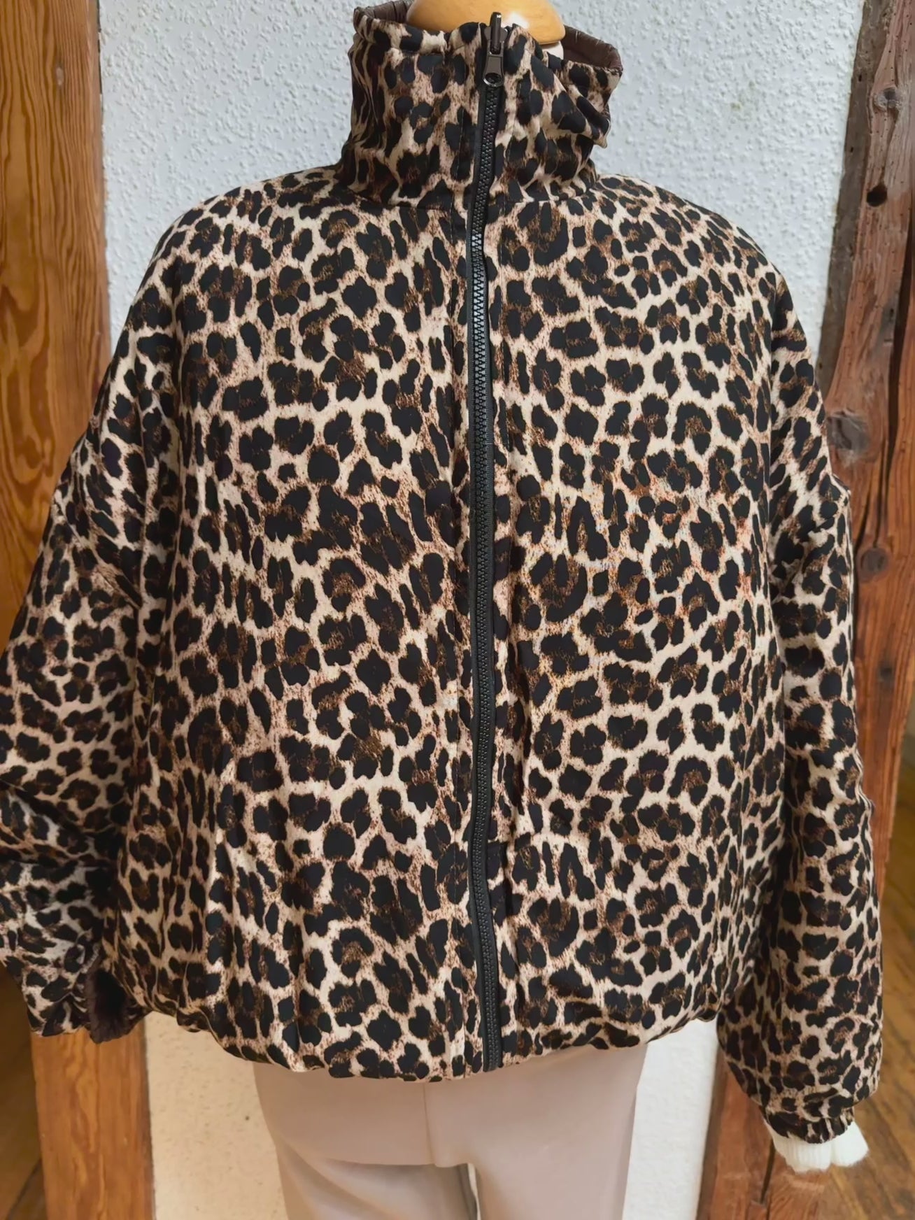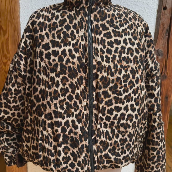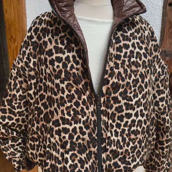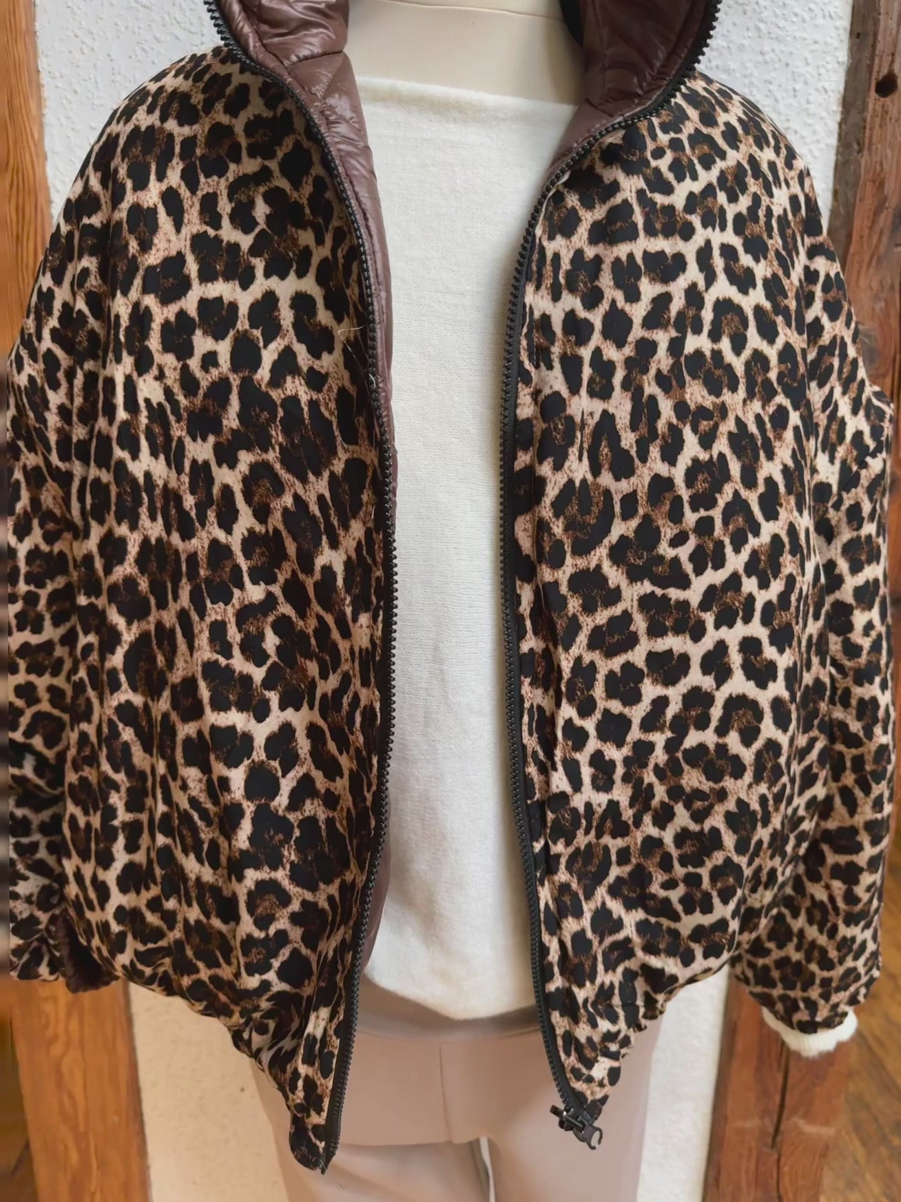Blusig geschnitten, eine Seite gesteppter Nylon und die andere Seite im Animaldruck, Seitentaschen, Stehkragen, elastische Bündchen in der Taille und an den Ärmeln, Onesize Gr 36 - Gr 42
