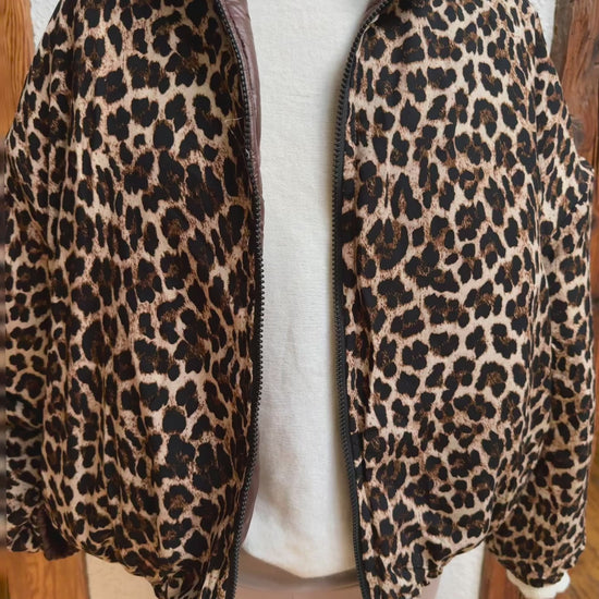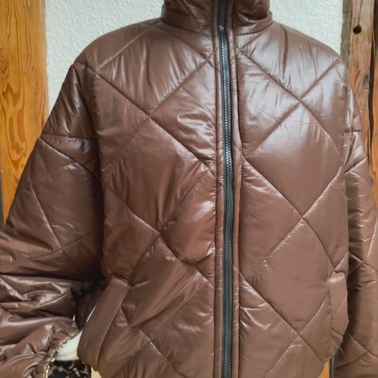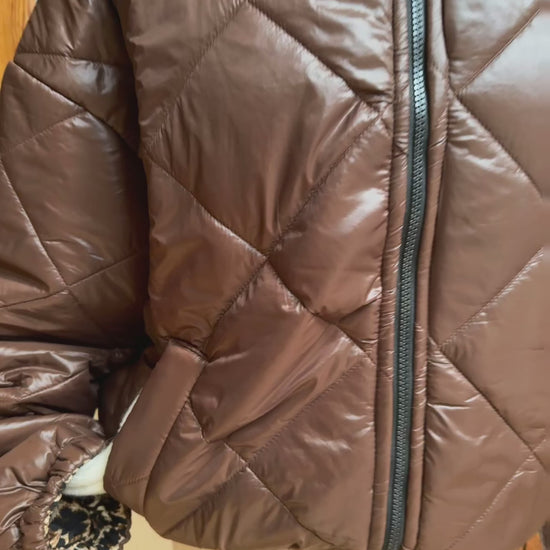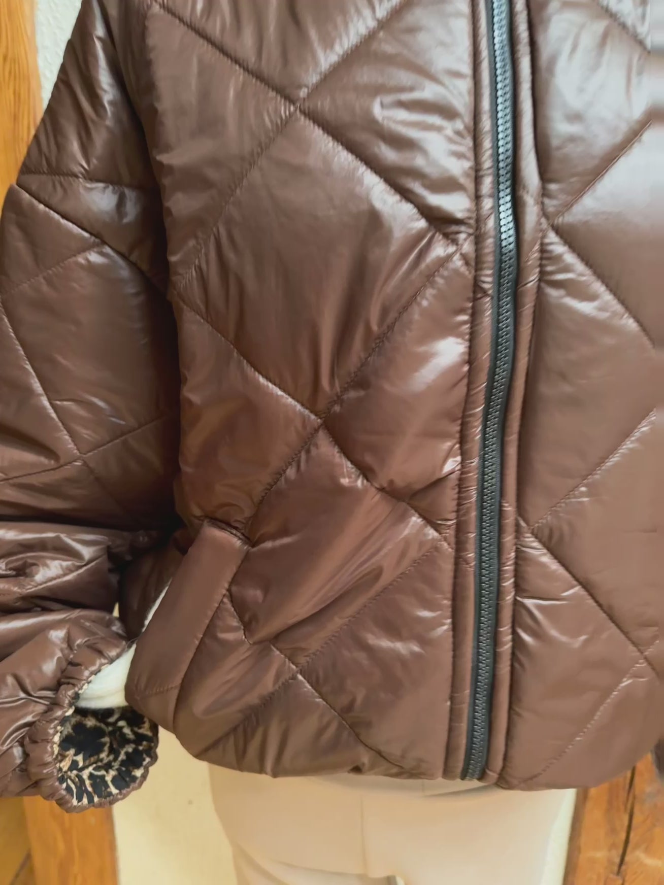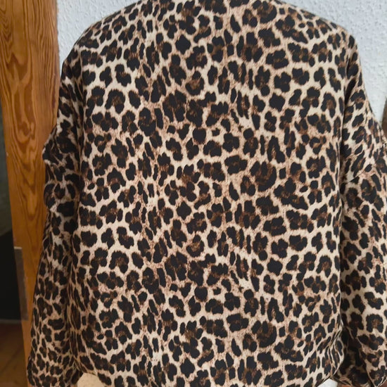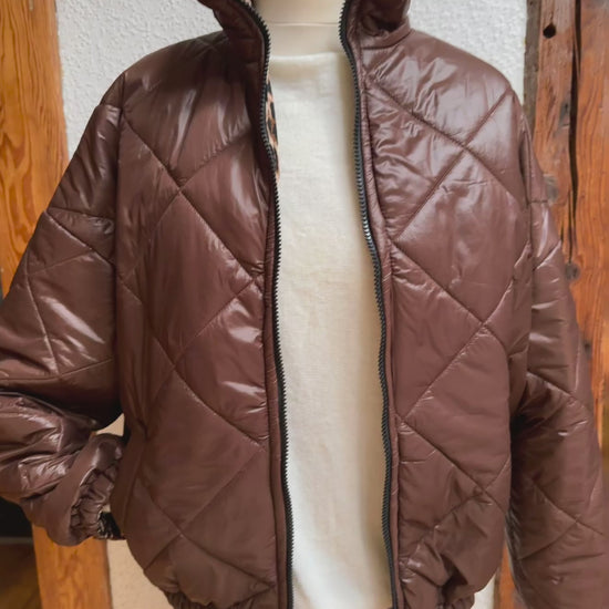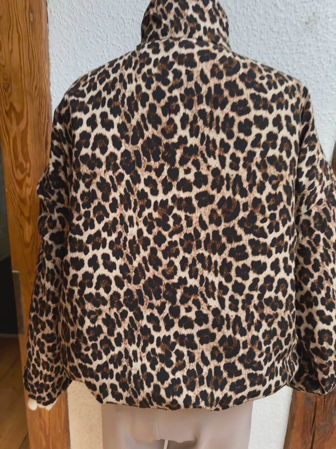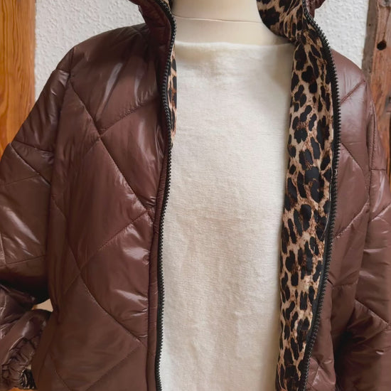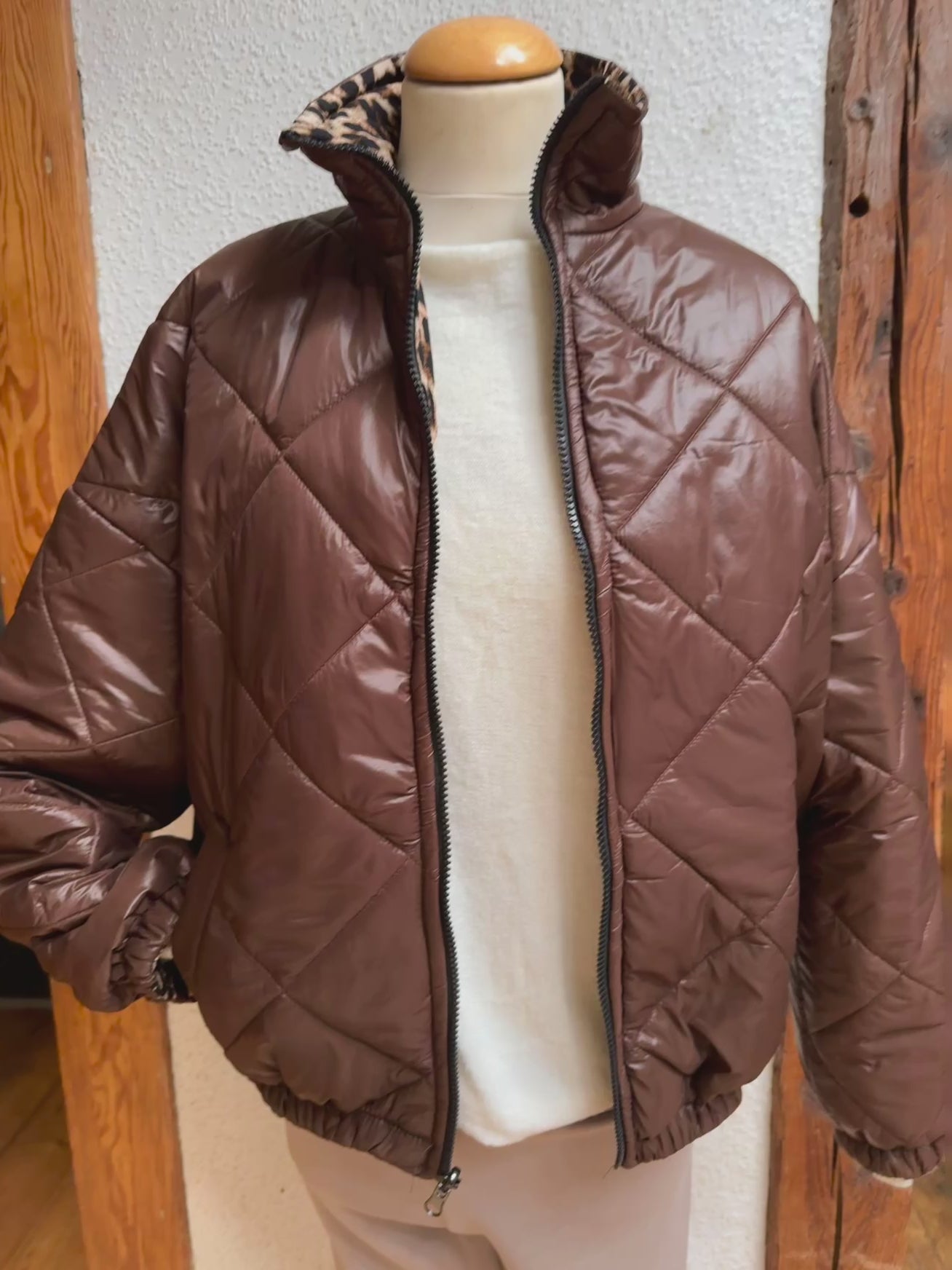 Blusig geschnitten, eine Seite gesteppter Nylon und die andere Seite im Animaldruck, Seitentaschen, Stehkragen, elastische Bündchen in der Taille und an den Ärmeln, Onesize Gr 36 - Gr 42