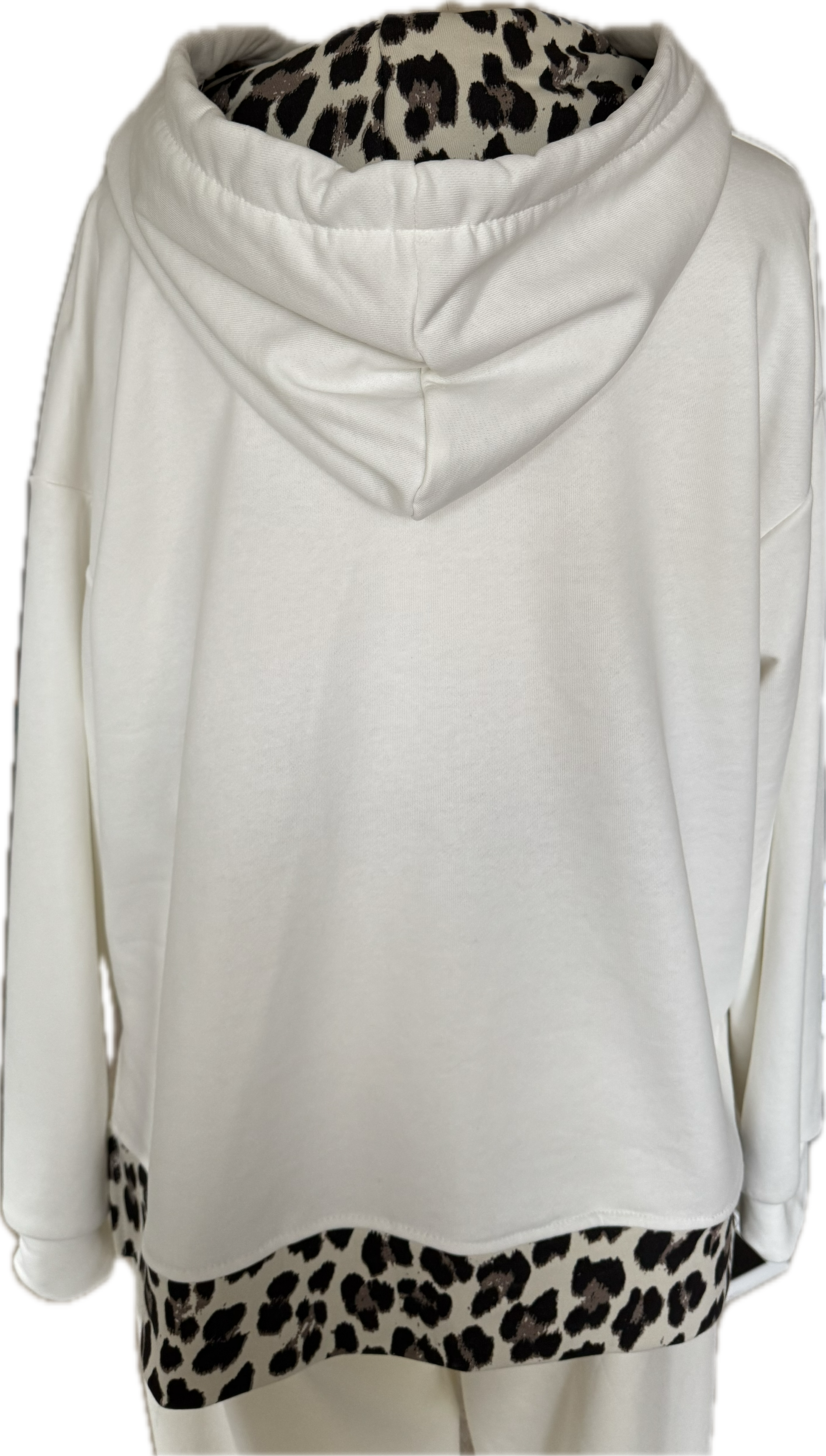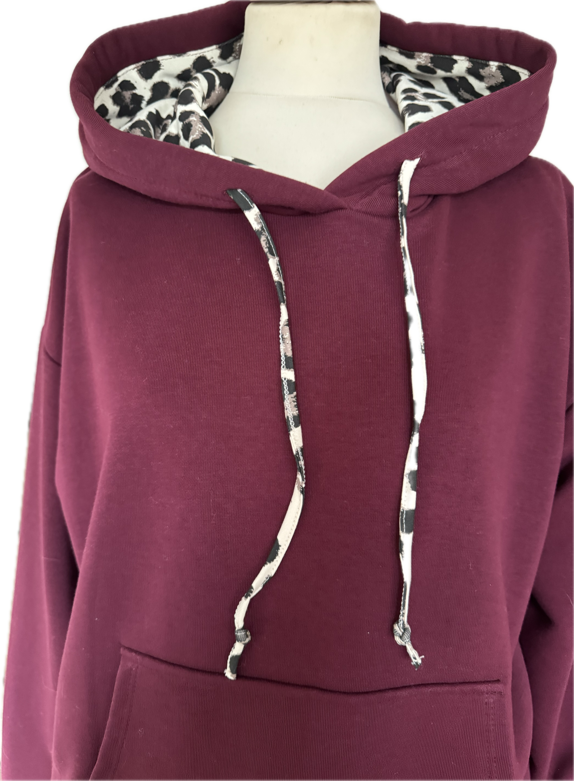 Hoodie mit Bauchtasche, Kapuze gefüttert im Animaldruck, hinten 8 cm breiter Abschluß im Animaldruck, tolle Farbe weinrot oder in creme, Onsize Gr 36 - Gr 42 Material 80% Baumwolle und 20% Polyester