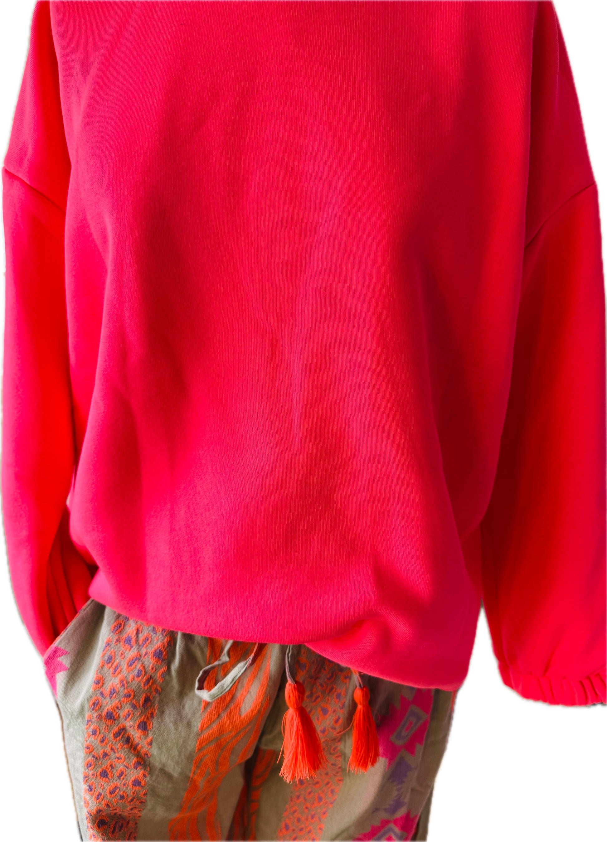 Rundhals, kräftiges neonpink, aufgeschäumter Schriftzughinten "ICONIC", Onesize Gr 36 - Gr 42, Länge 65 cm und Brustweite 70 cm 65% Baumwolle und 35% Polyester, super kuschelig (Hose bunt, 39,90 €)